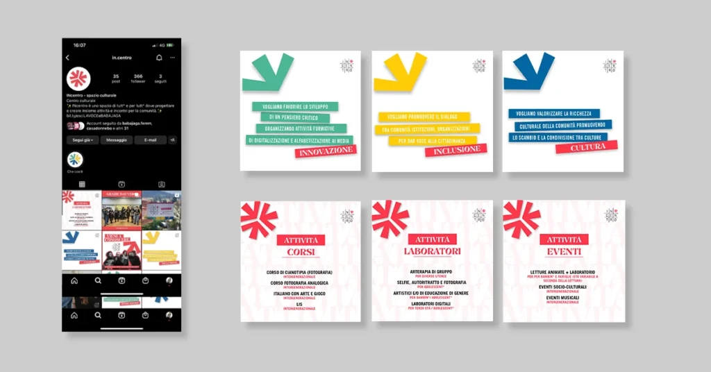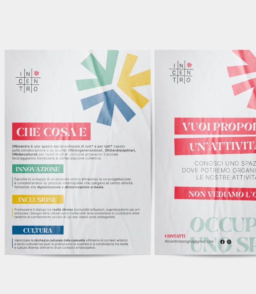 Grazie a questo lavoro di graphic design, IN CENTRO dispone ora di un’identità visiva forte, inclusiva e facilmente riconoscibile, perfetta per supportare la sua crescita e il suo impatto sulla comunità di Bologna.